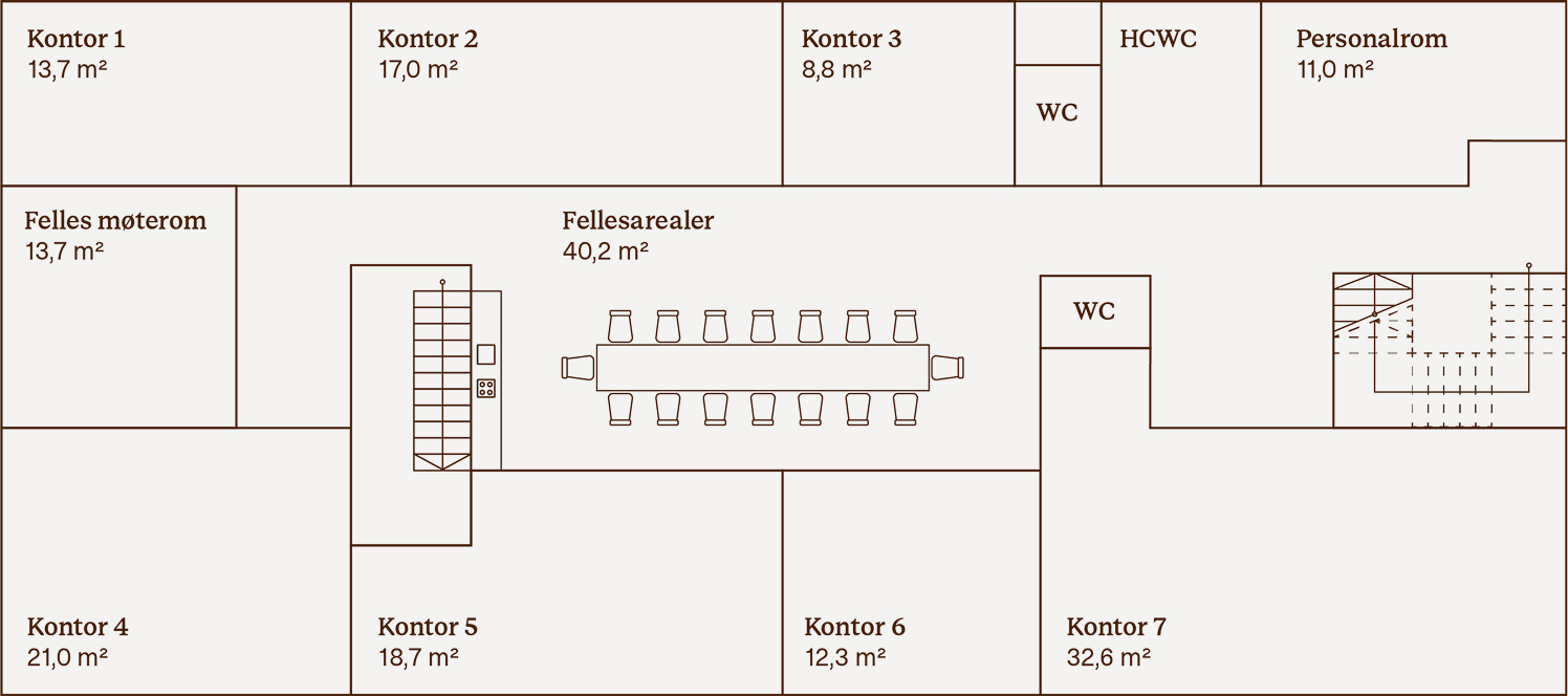 - 7 kontorer (8,8–32,6 m²)
