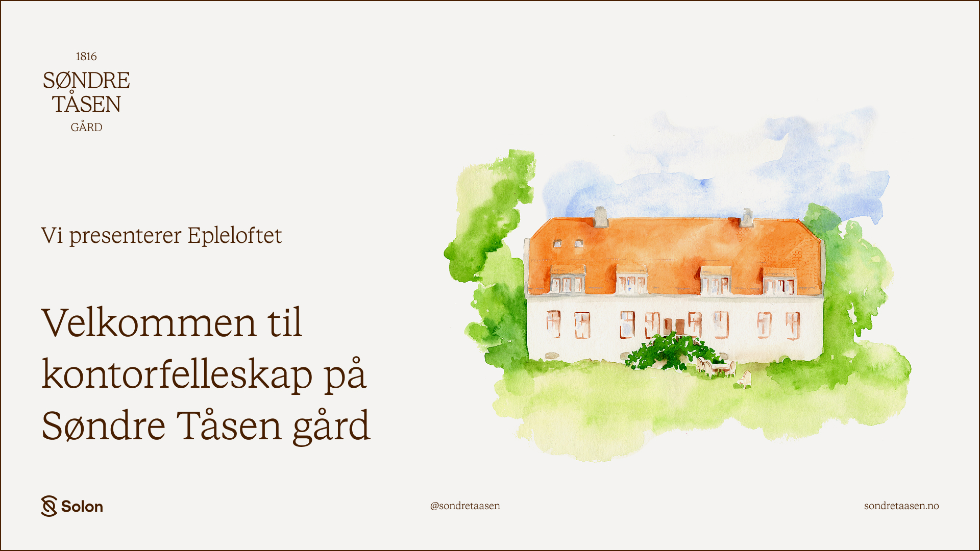 Søndre Tåsen gård er en vakker, historisk bygning som ligger idyllisk til i en frodig eplehage på Tåsen. I 2026 åpner gården med kafé, restaurant og selskapslokaler i første etasje og kjeller. På loftet etableres et nytt kontorfellesskap for små bedrifter og frilansere.